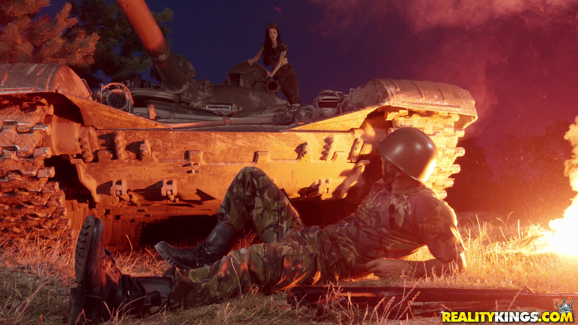 Грудастая японская девушка Rae Lil Black вылезла из танка и стала целоваться на броне с мужчиной в камуфляже. Мужчина снял с темноволосой азиатки штаны и принялся отлизывать бритую киску. Насладившись куни, японка сделала мужику глубокий минет на поляне возле танка и занялась с ним сексом. Пара трахалась в сумерках до тех пор, пока мужчина не кончил на лицо девушки.