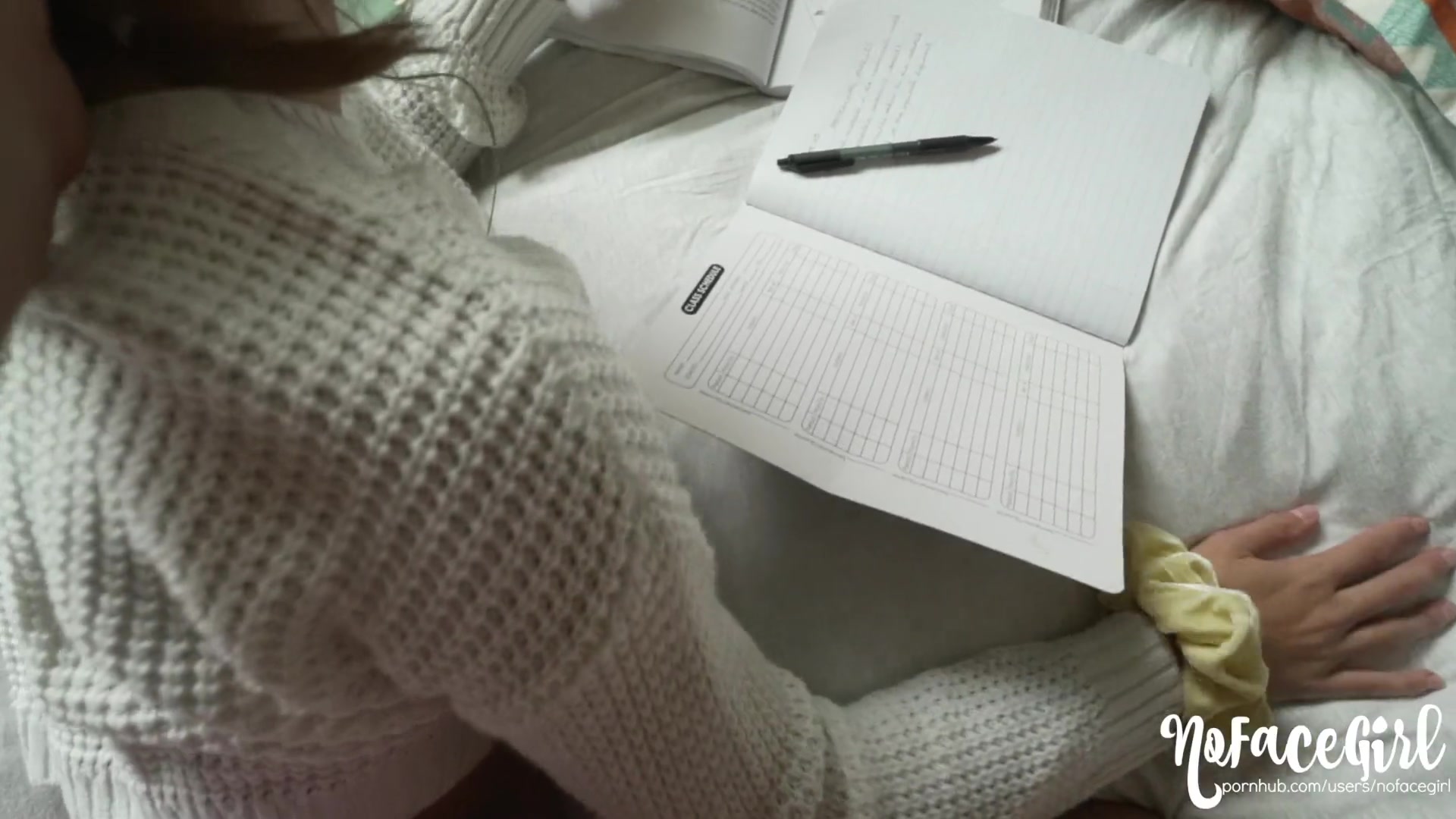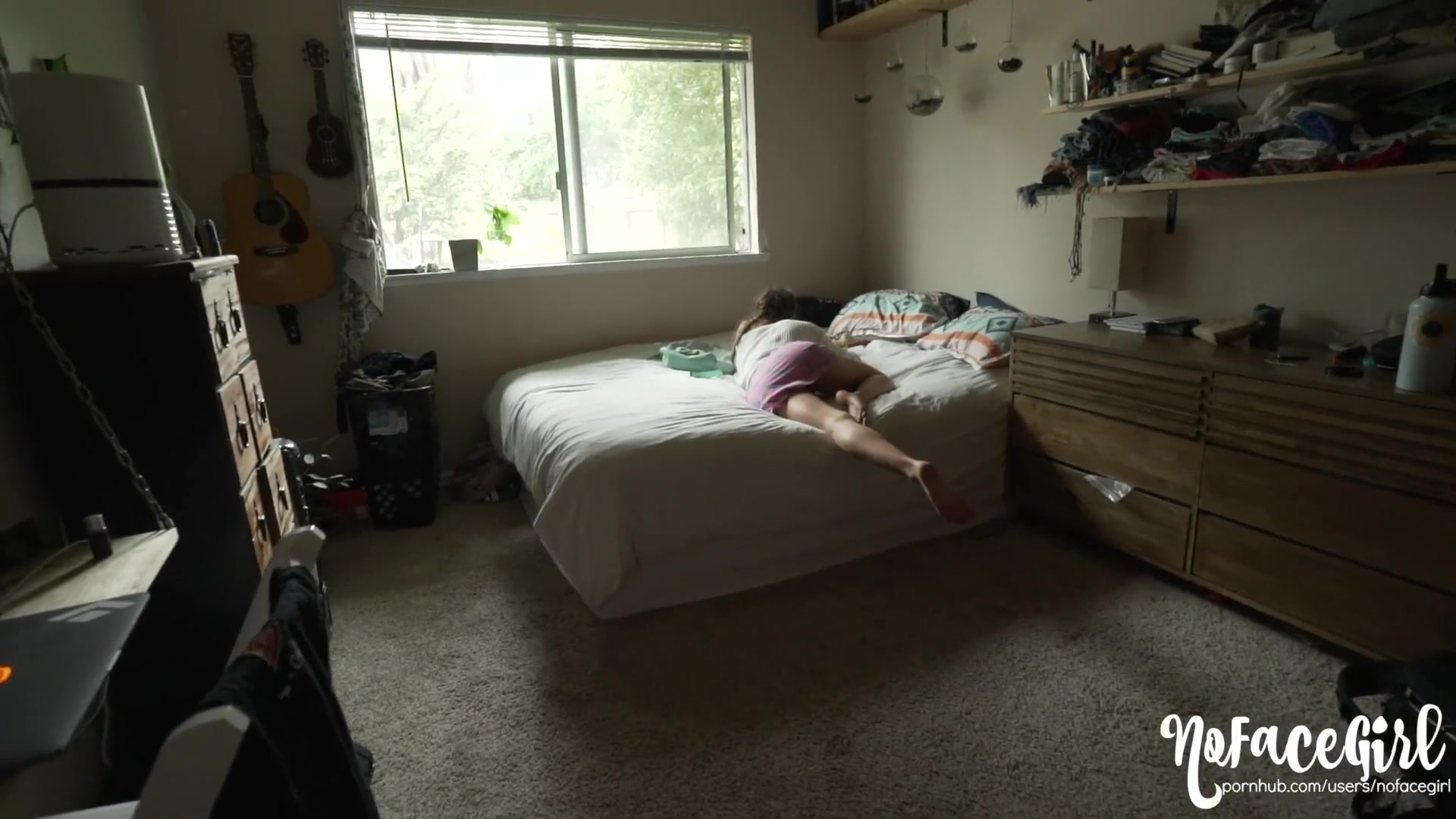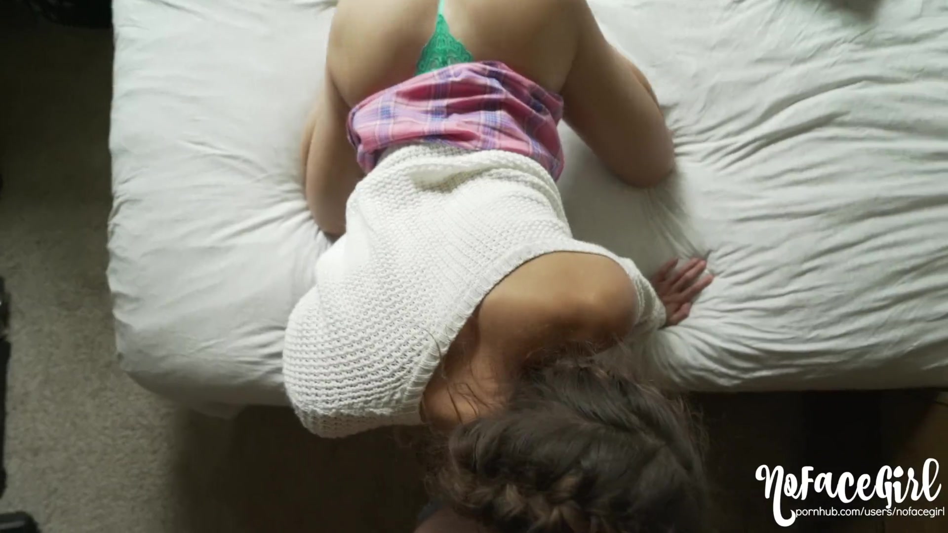 Молодой человек подошёл к лежащей на кровати, очкастой девушке с косичками NoFaceGirl и задрал её короткую юбочку. Он поласкал попу и киску девушки, а затем дал ей отсосать свой пенис. После отличного минета, перевозбуждённый бойфренд оттрахал худую подружку в позе раком и залил спермой её чисто побритую письку.