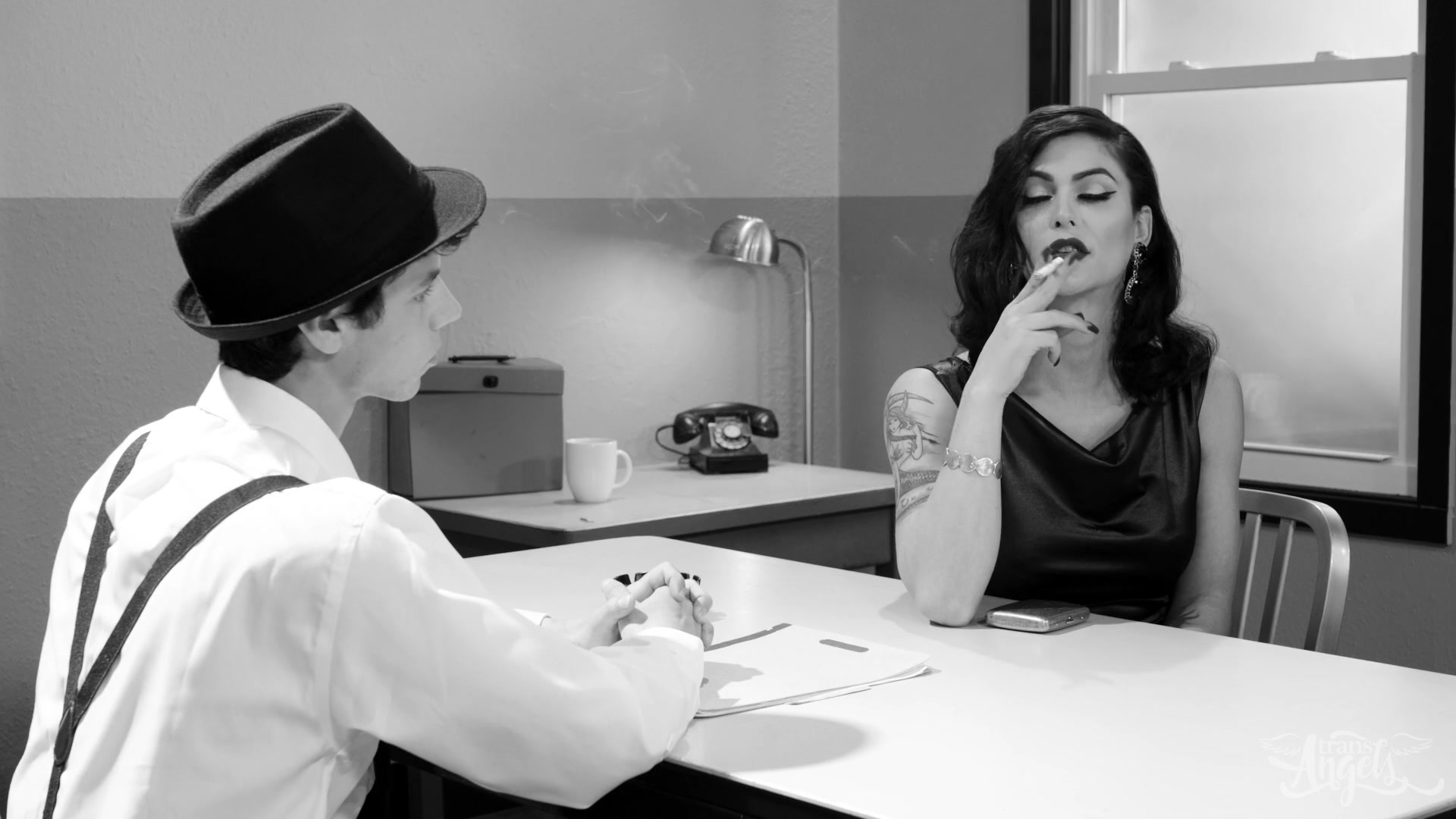Возбуждённый парень в шляпе, поцеловал сиськастого татуированного транссексуала Domino Presley и снял с него облегающее платье. Он сделал трансу в чёрных чулках анилингус и отсосал член, после чего транссексуал сделал парню минет и подрочил член сиськами. Разгорячённый транс отпердолил парня в очко на рабочем столе и забрызгал его лицо спермой.