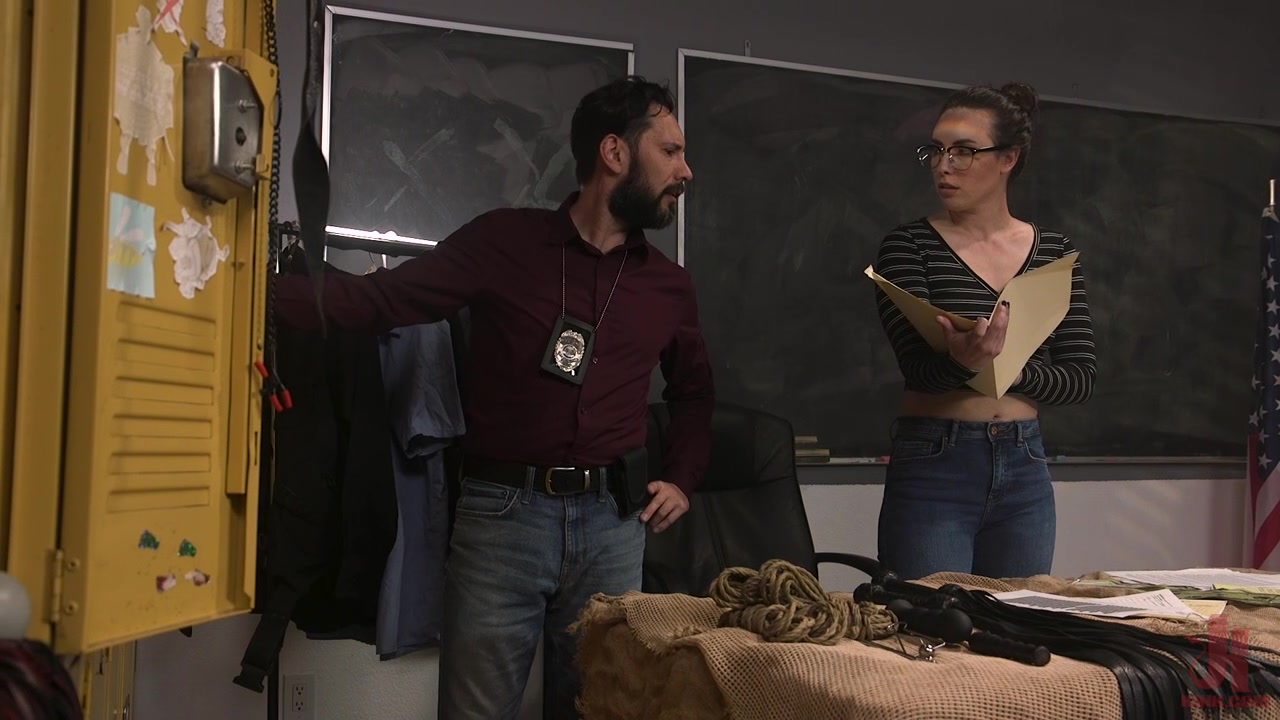 Раздражённый детектив надел наручники на очкастую шатенку Casey Calvert и вставил ей в рот кляп. Он стянул с секс рабыни джинсы и отхлестал её по голой жопе. Бородатый господин подрочил связанной сучке пизду и принялся трахать её раком в вагину. Он заставил девку сосать член и подрочил клитор вибратором, а затем ещё и отпердолил в анал. В конце оттраханная во все щели рабыня получила сперму на бритый лобок.