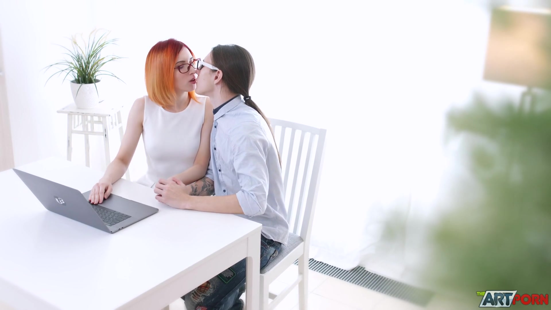 Очкарик поцеловал сидящую за ноутбуком рыжеволосую русскую подружку в очках и усадил на стол. Он принялся отлизывать бритую писю девушки, после чего дал ей отсосать свой член. Затем паренёк снял с худой тёлки белое платье и стал трахать её на столе. Он отпердолил подругу во влагалище и узкий анус, после чего заполнил её ротик спермой.