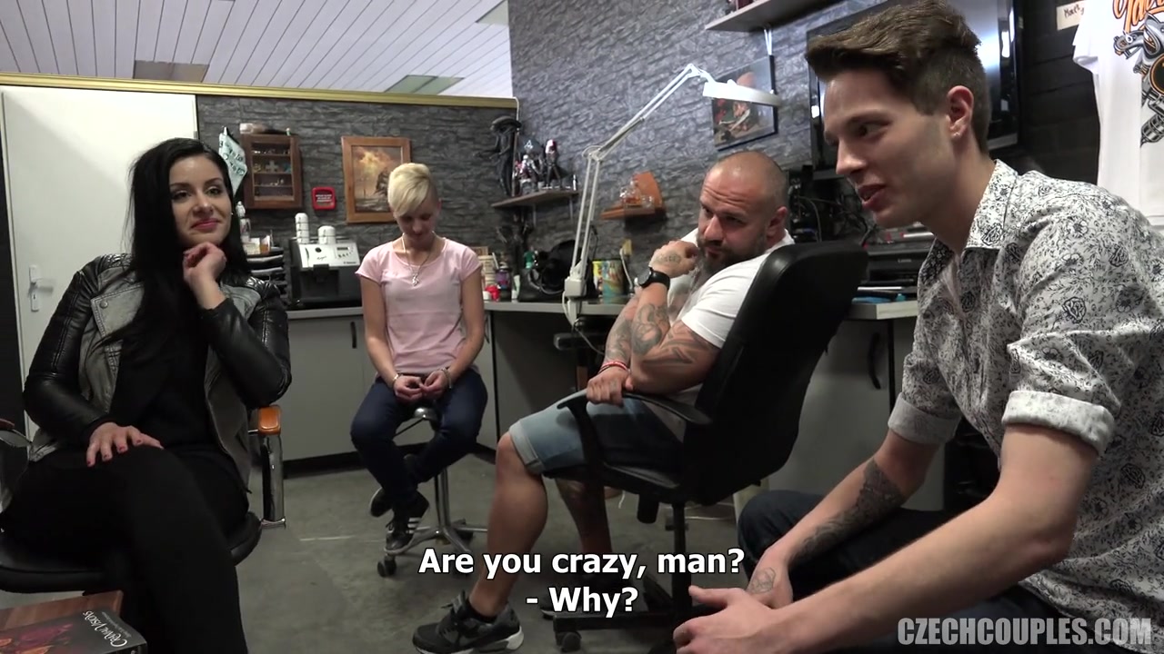 Две молодые чешские пары решили попробовать свинг секс и встретились в выходной день. После коротких приветствий, свингеры пошли в пирсинг салон и занялись там групповым сексом. Худая блондинка с пирсингом, сразу стала отсасывать у парня член, а грудастая брюнетка сделала минет приятелю блондинки. Свингеры трахались в салоне и менялись партнёрами, после чего парни залили спермой большую грудь брюнетки.
