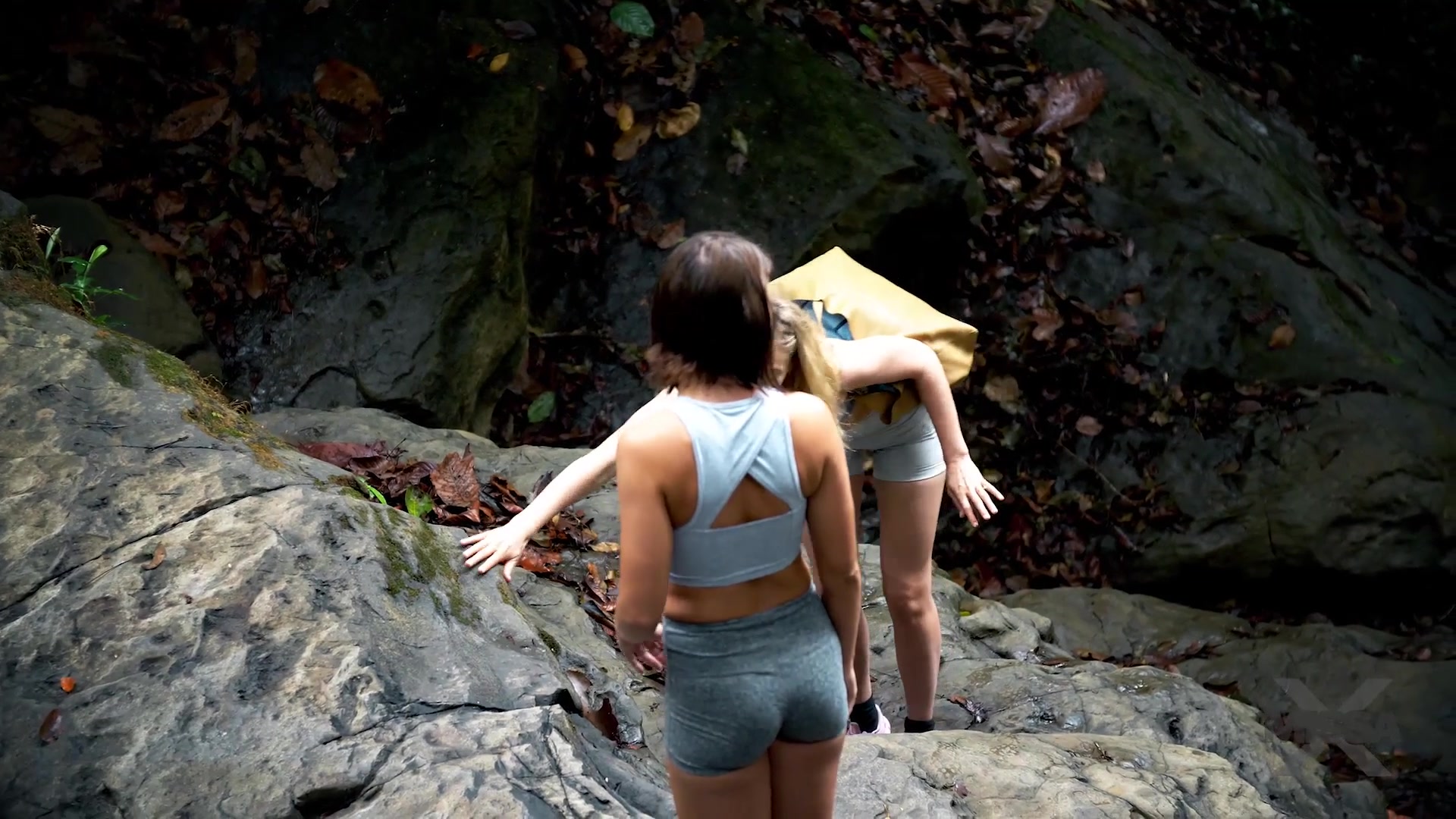 Зрелая светловолосая лесбиянка ебётся с молодой шатенкой у водопада