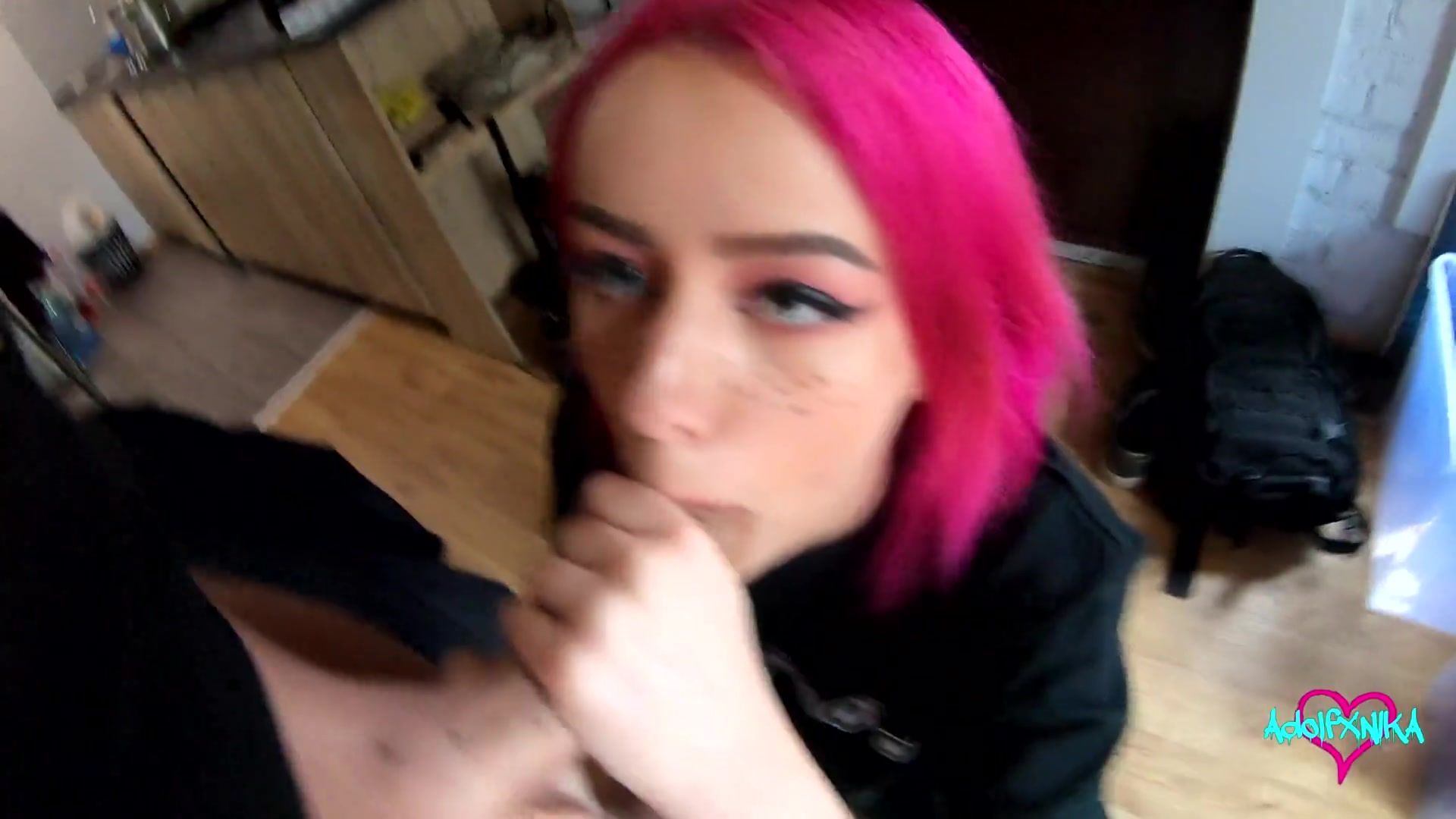 В гости к парню пришла грудастая русская девчонка с розовыми волосами Ника и недолго думая принялась делать ему минет. После глубокого отсоса, перевозбуждённая девка стала бешено трахаться со счастливым парнем на кровати. Она была оттрахана в киску в разных позициях и получила порцию спермы на лицо.