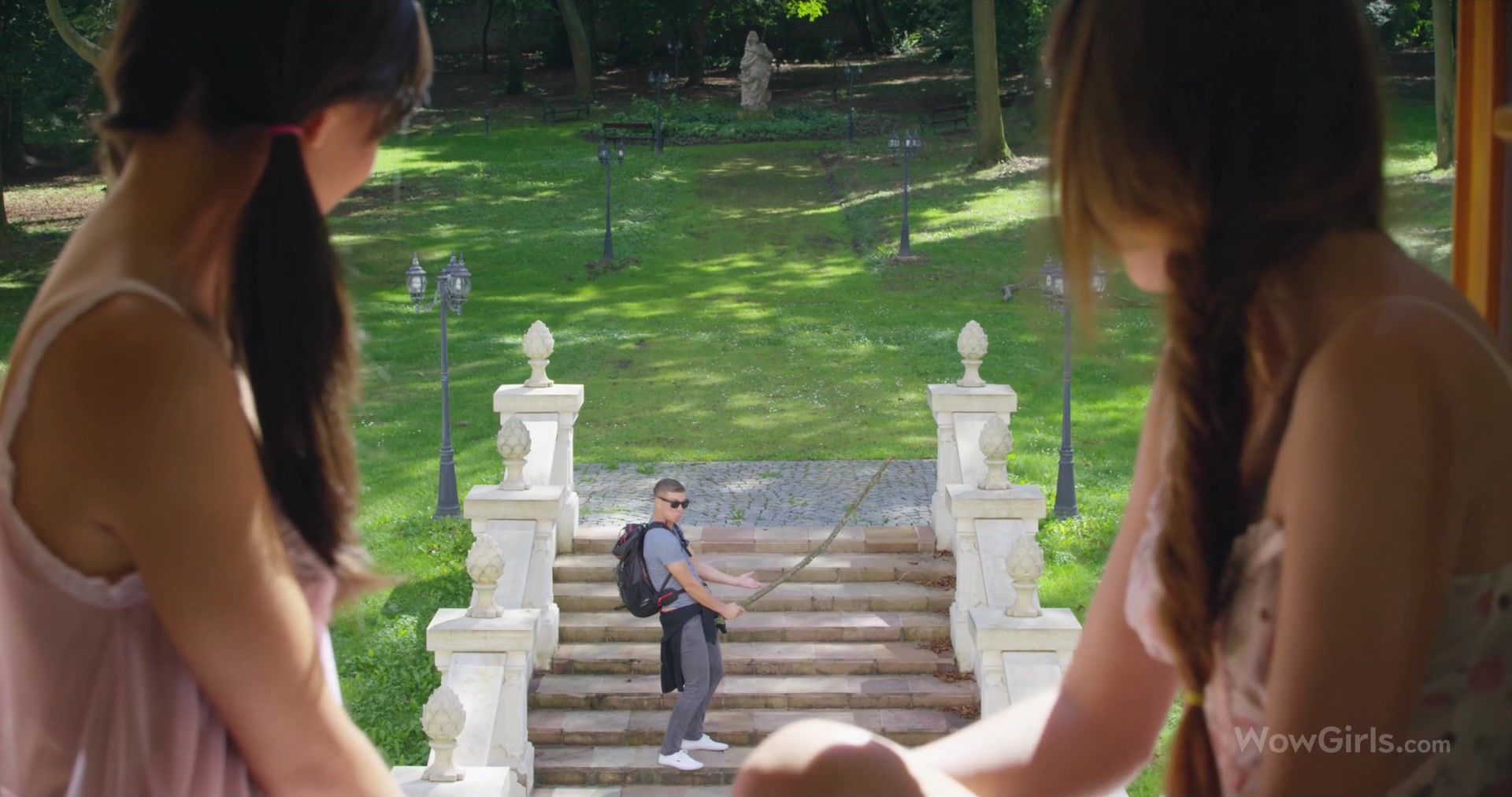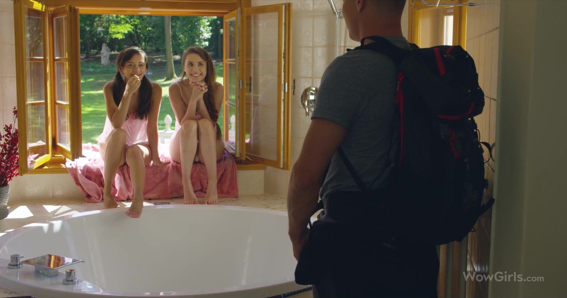 Две симпатичные украинские девчонки Shrima Malati и Elle Rose, между собой обсудили гуляющего во дворе парня и пригласили его в гости. Девушки залезли с парнем в ванну и подрочили член, после чего направились в спальню. Там они дали парню отлизать свои бритые киски и подставили их под его твёрдый член. Паренёк оттрахал двух разгорячённых девушек на кровати и залил спермой их язычки.