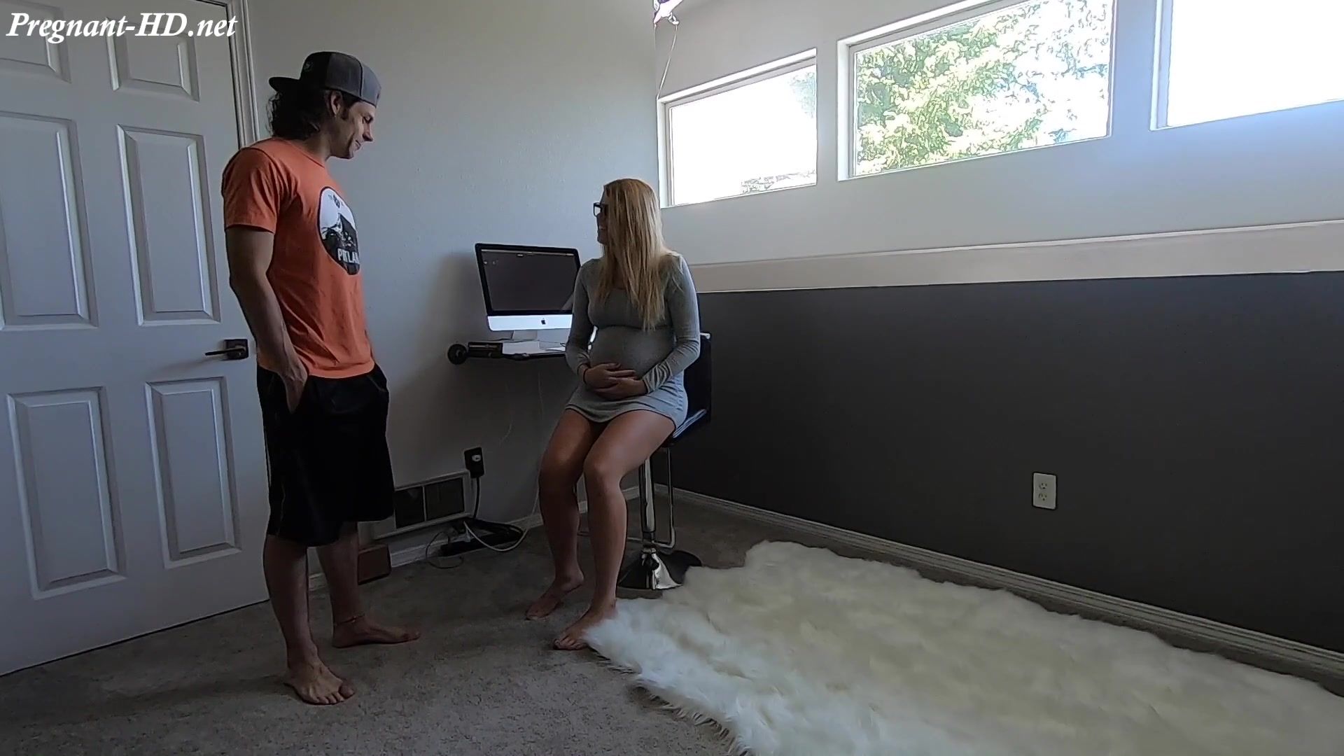 Парень зашёл в комнату, где работала за компьютером очкастая беременная блондинка с ником PowerCoupleXOXO и решил потрогать её большой животик. Во время ощупывания живота, беременная девушка возбудилась и стала трогать член парня. Она подрочила член и дала оттрахать себя в бритую киску. Перевозбуждённый паренёк отымел беременную на полу и забрызгал спермой её большой живот.
