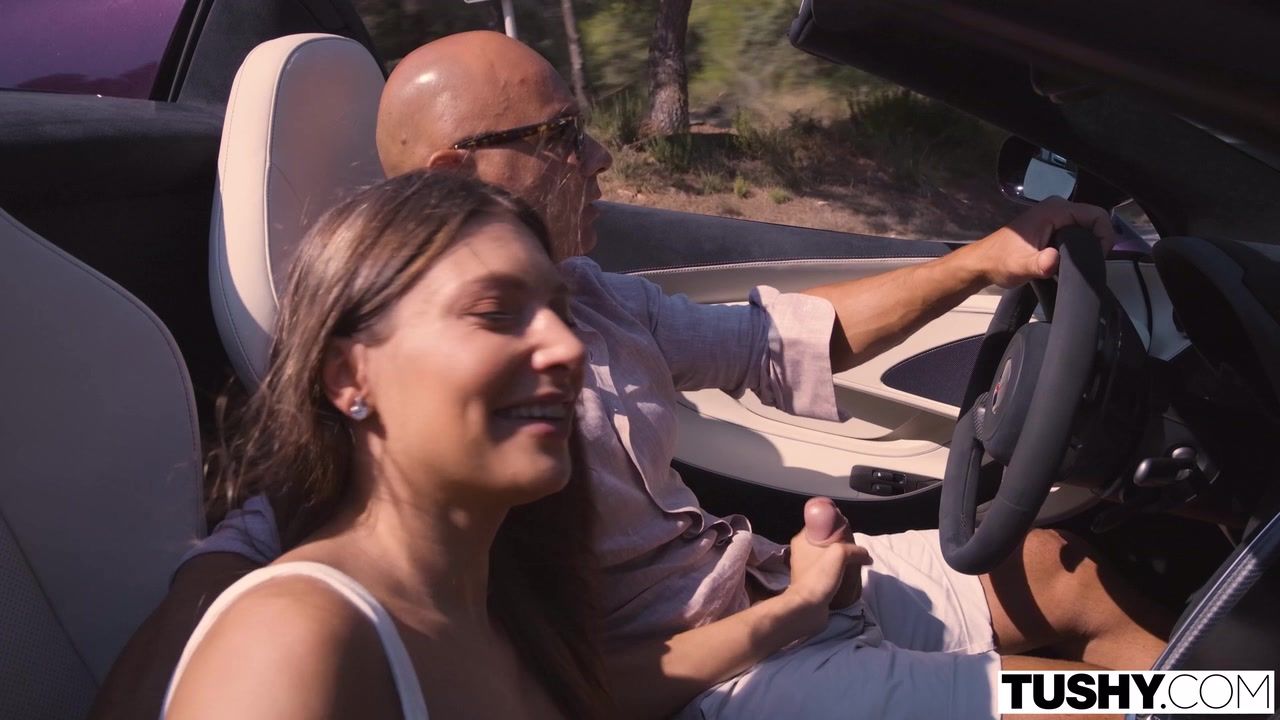 Лысый мужчина прокатил в своей машине сексуальную украинскую девушку с русыми волосами Talia Mint. Во время поездки, озорная девчонка дрочила член сидевшему за рулём лысому водителю, а затем делала минет и трахалась с ним на обочине. После секса на свежем воздухе, лысый привёз девку домой, дал ей отсосать член и сделал куни. Он оттрахал красотку на кровати в киску и анус, после чего залил её ротик спермой.
