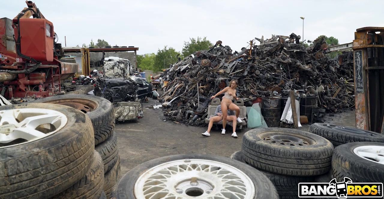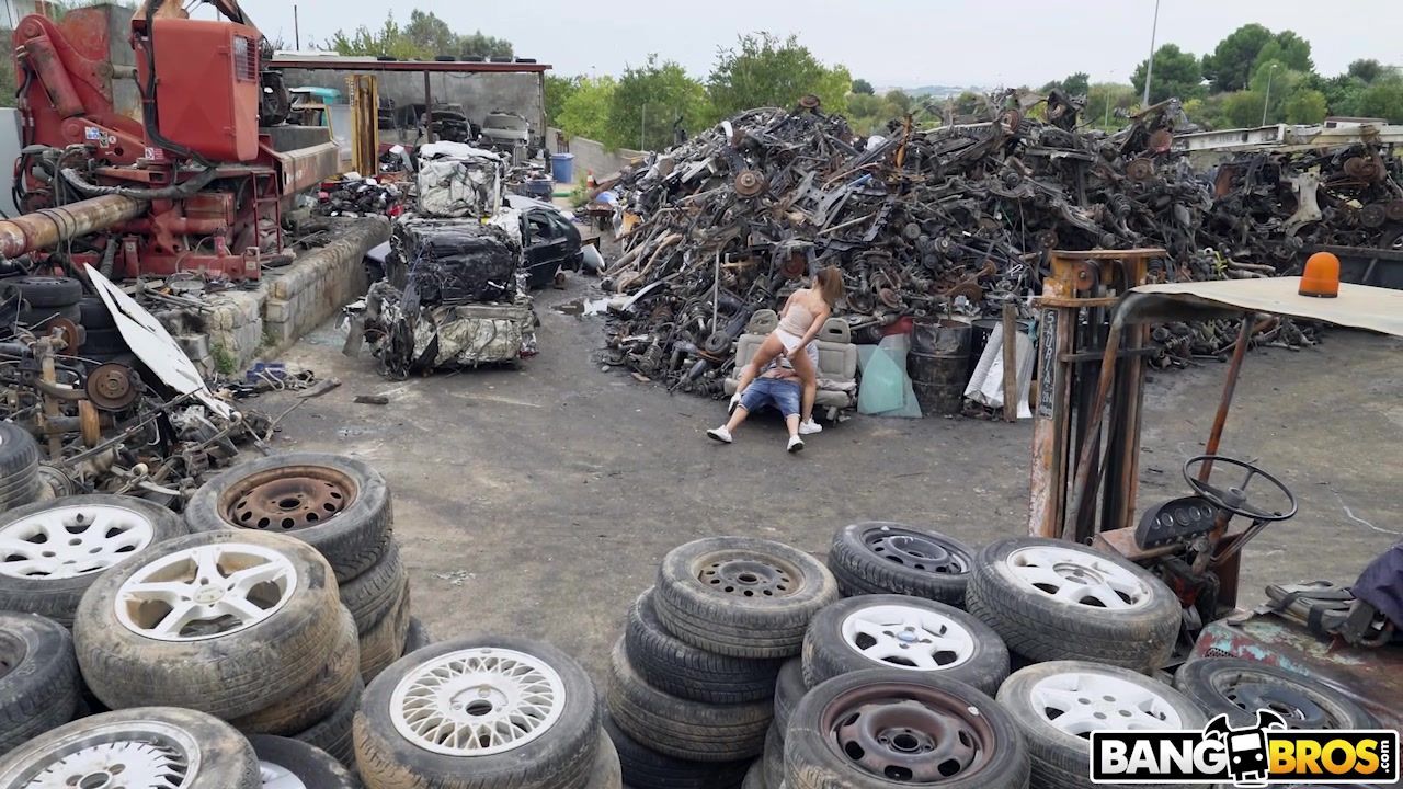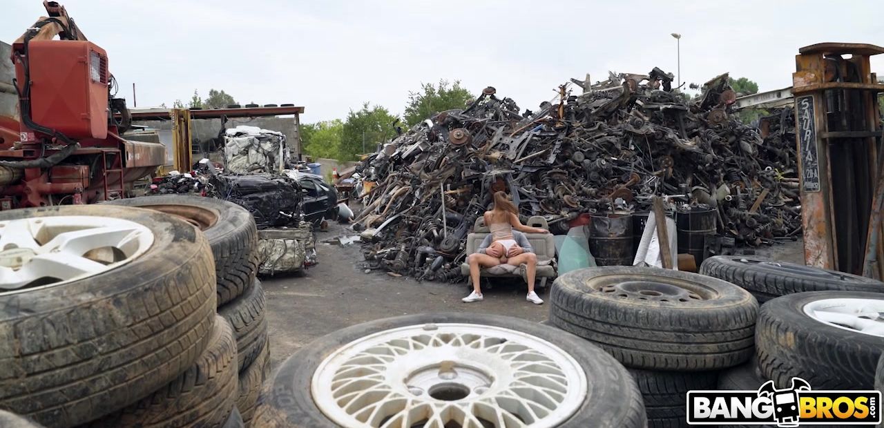 Молодая шатенка Ginebra Bellucci, пришла на автомобильную свалку с лысым приятелем и стала делать ему минет на свежем воздухе. После хорошего отсоса, парень принялся трахать девчонку во влагалище и разработанный анус. Он отпердолил горячую подружку на автомобильных сиденьях и забрызгал спермой её язычок.