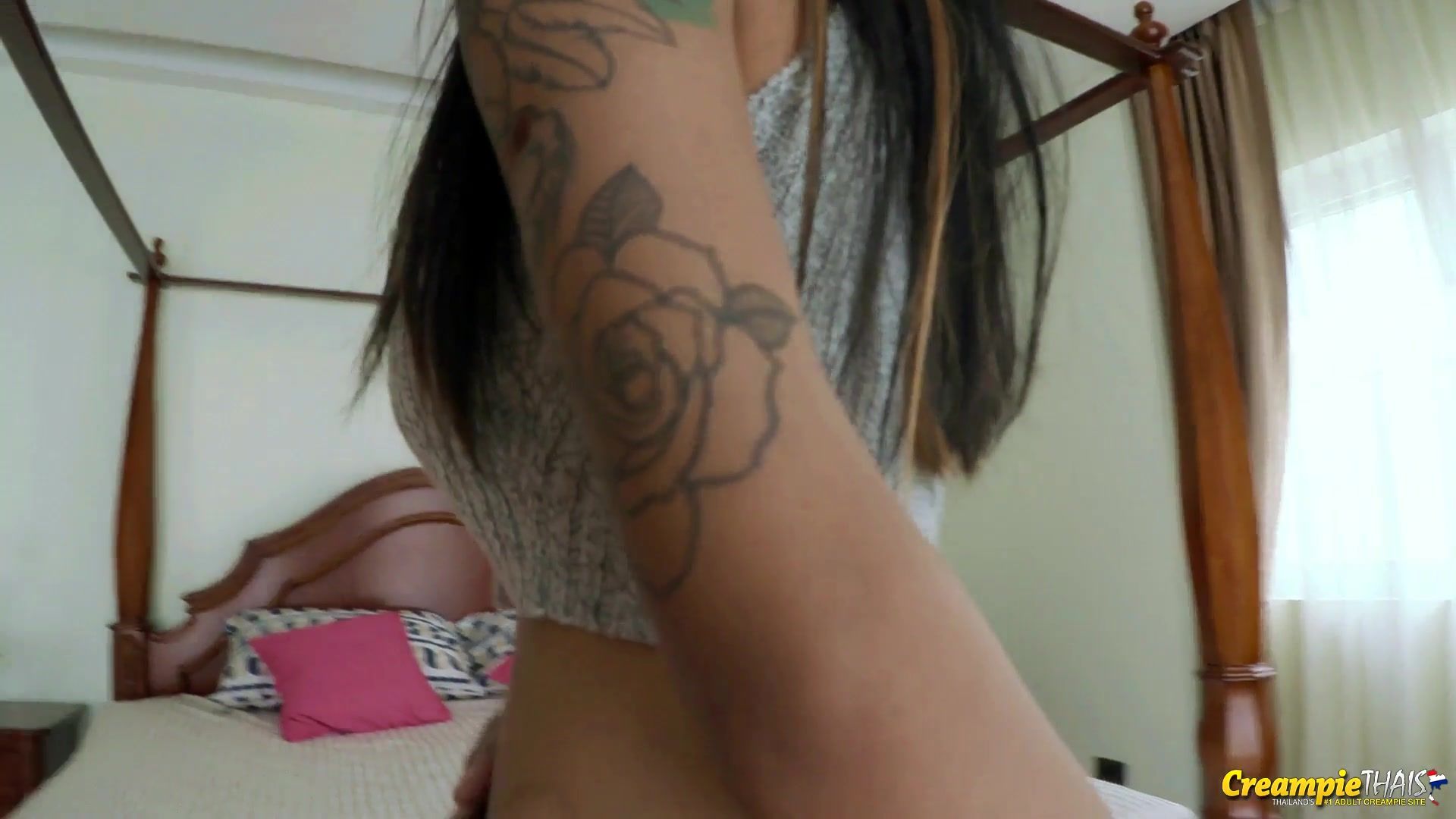 Красивая тайская брюнеточка с татуированным телом отсосала у туриста член и трахалась с ним на кровати до тех пор, пока он не кончил в её чисто побритую письку.