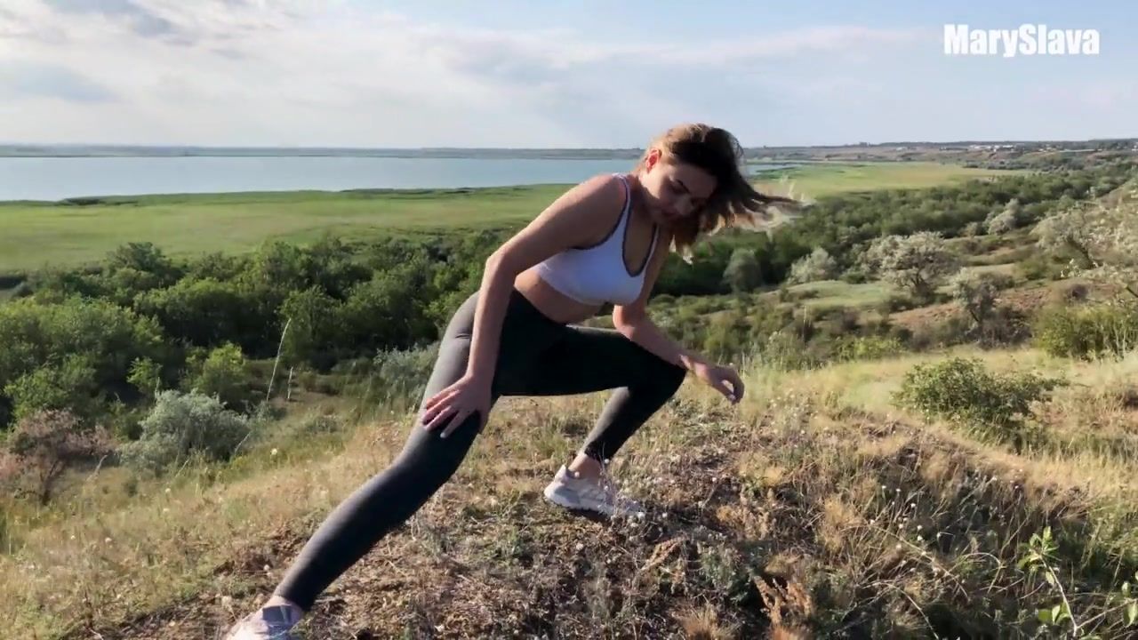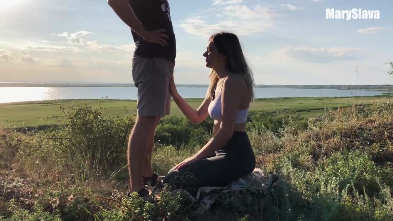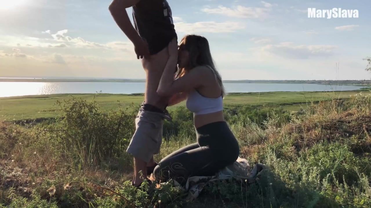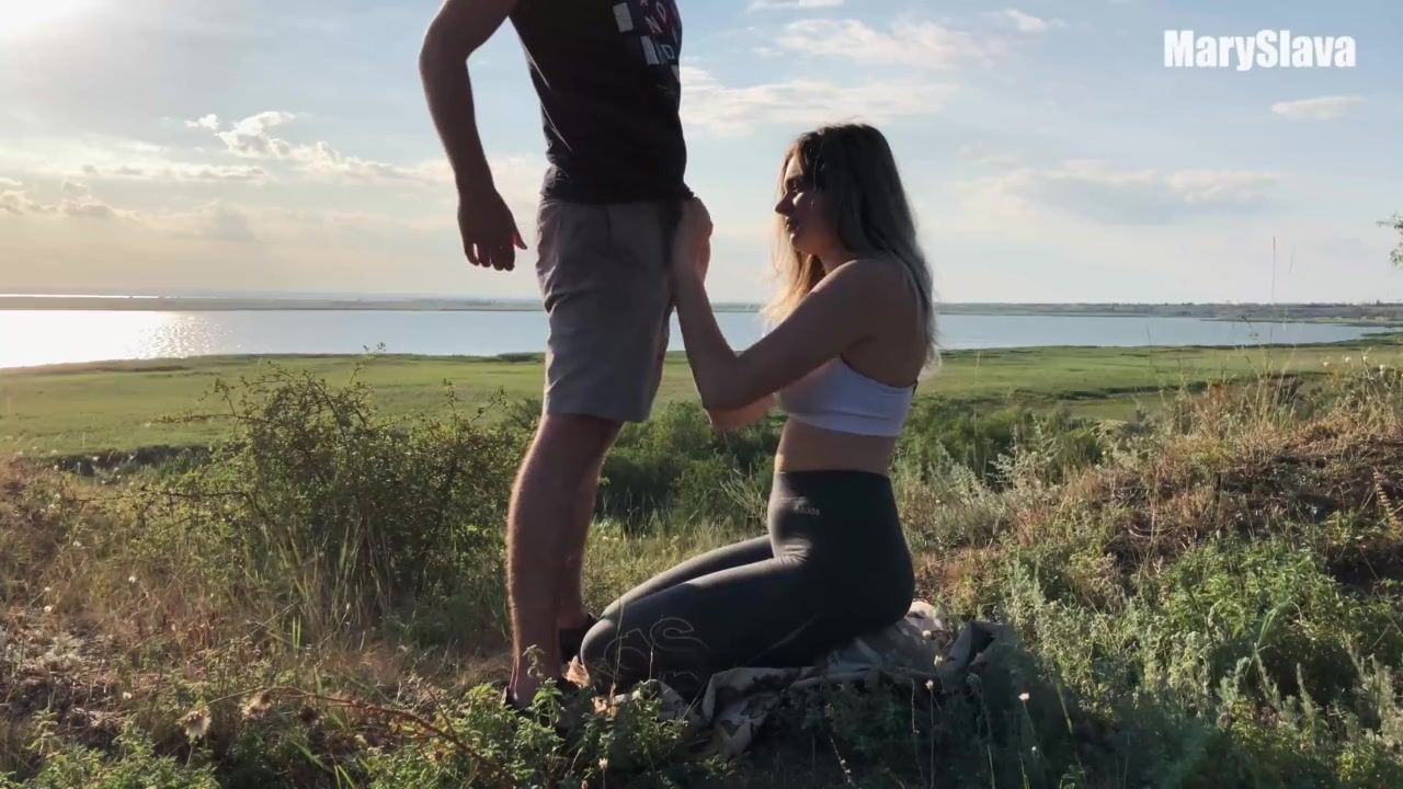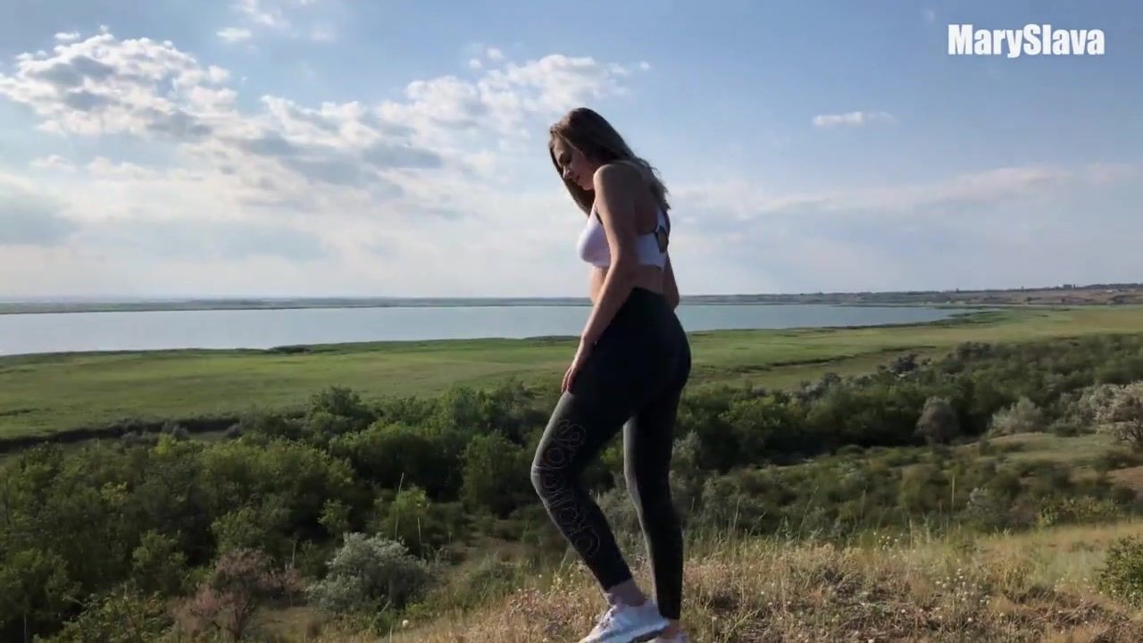 Юная русская блондинка с большими титьками MarySlava, в легинсах делала гимнастику на берегу озера. Внезапно девка сняла легинсы, под которыми на ней не были одеты трусики и показала парню свою голую попу. Затем она сделала счастливому парню минет на траве и дала оттрахать себя раком, после чего парень забрызгал спермой её сиськи.