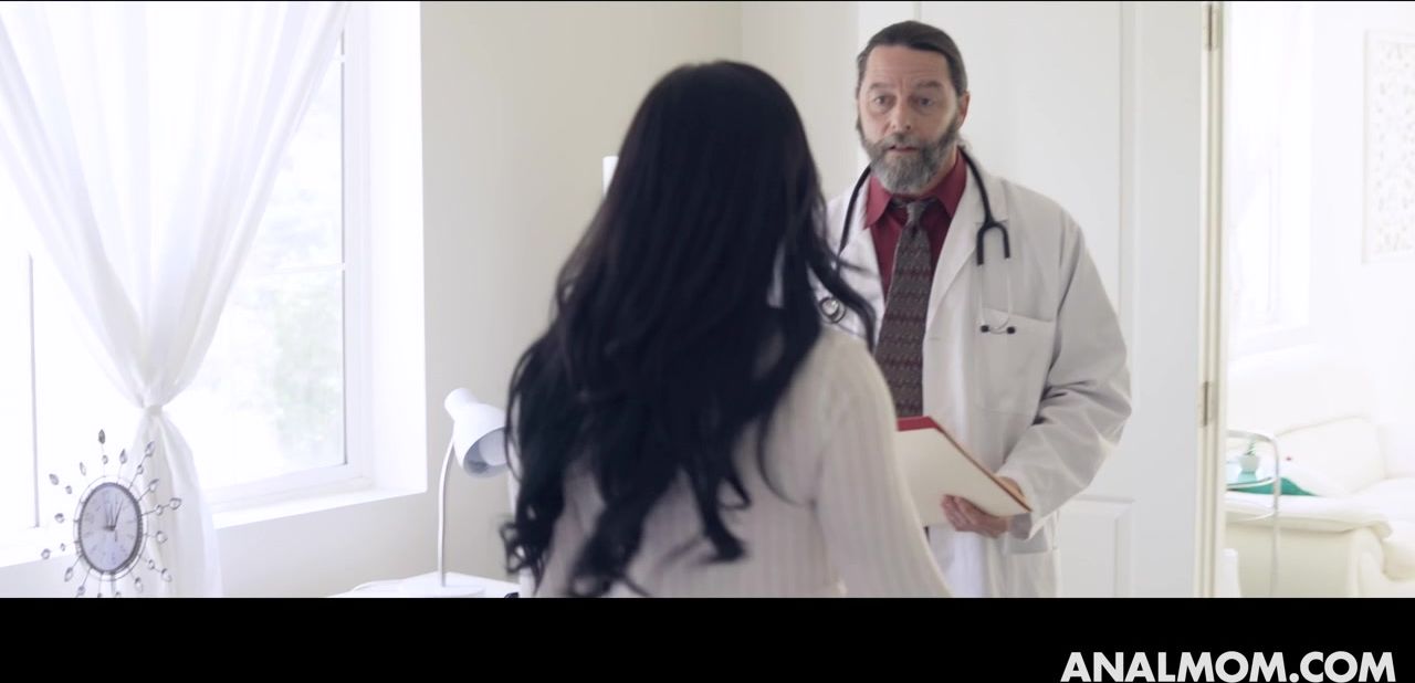 Похотливый бородатый доктор потрогал грудь у зрелой брюнетки Jennifer White и засадил свой член в её смазанное очко. Мужчина стал трахать дамочку в анал, после чего отлизал ей клитор и продолжил анальную еблю в спальне. Стройная милфа сделала ему минет и после анала на кровати, получила сперму в анус.
