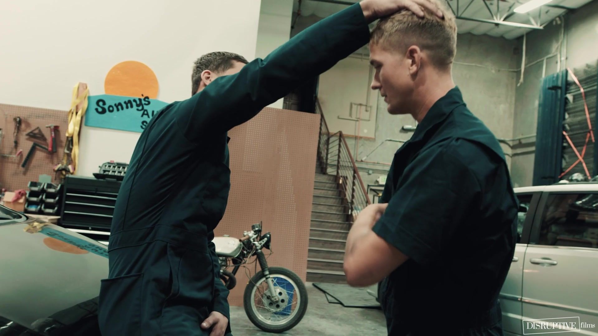 Двое молодых мужчин провели целый рабочий день в автомастерской и захотели заняться гей сексом. Тогда молодой работник сделал минет старшему товарищу с татуировками на теле и подставил анус под его твёрдый член. Он был оттрахан в очко небритым гомосексуальным мужчиной возле машины и забрызган спермой.