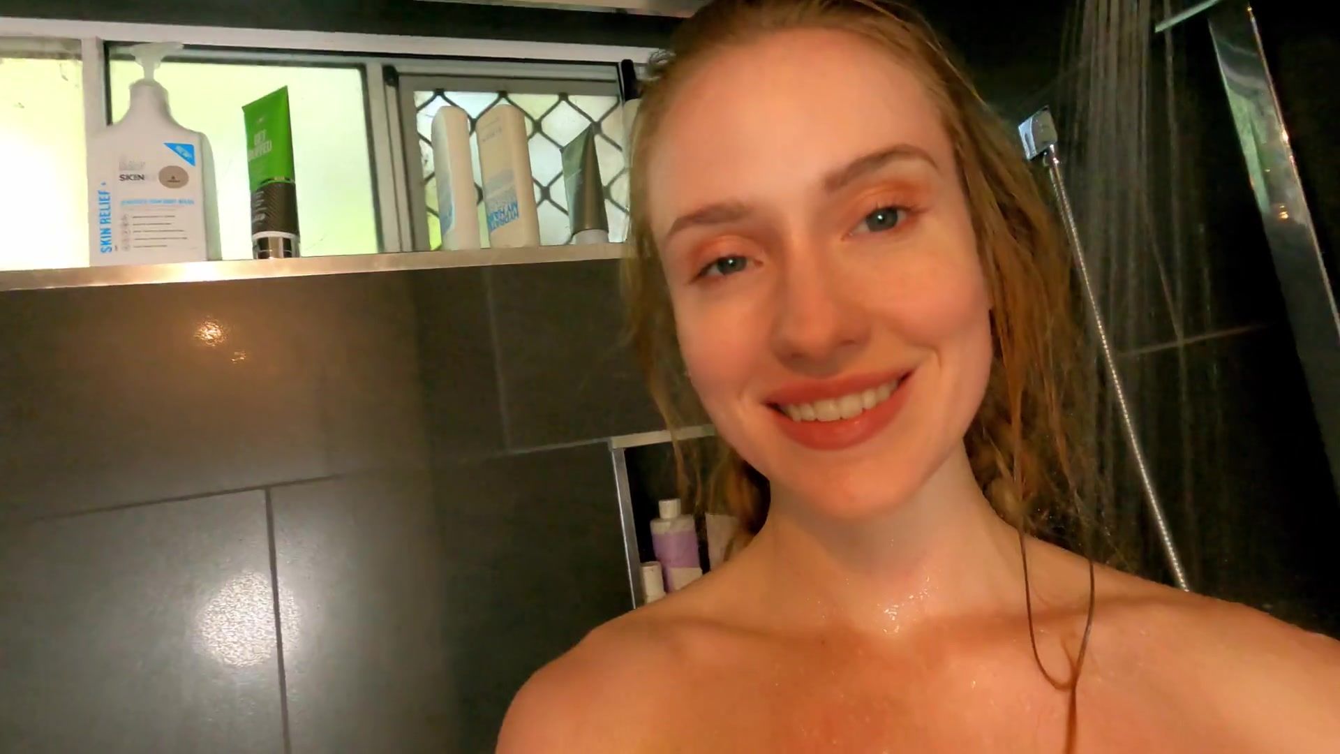 Красивая грудастая блондинка с косичками Scarlet Chase, в душе мастурбирует клитор пальцами и трахает себя фаллосом в анус.