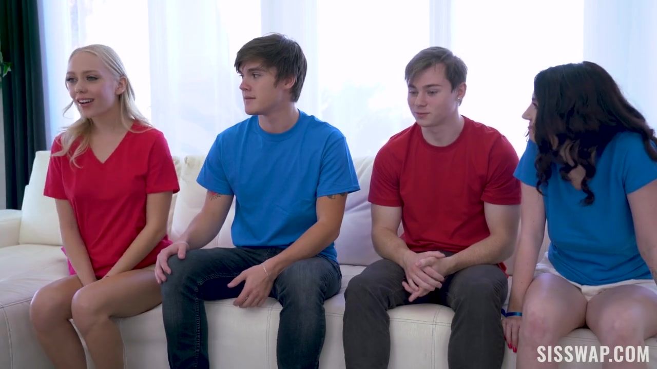Две молоденькие подруги - брюнетка Aria Carson и блондинка Braylin Bailey, целовались и занимались лесбийской любовью на кровати. Затем они вышли к двум молодым парням и стали делать им минет. После сочного отсоса, перевозбуждённые парни оттрахали сексуальных девчонок на диване в разных позах и забрызгали спермой их милые лица.