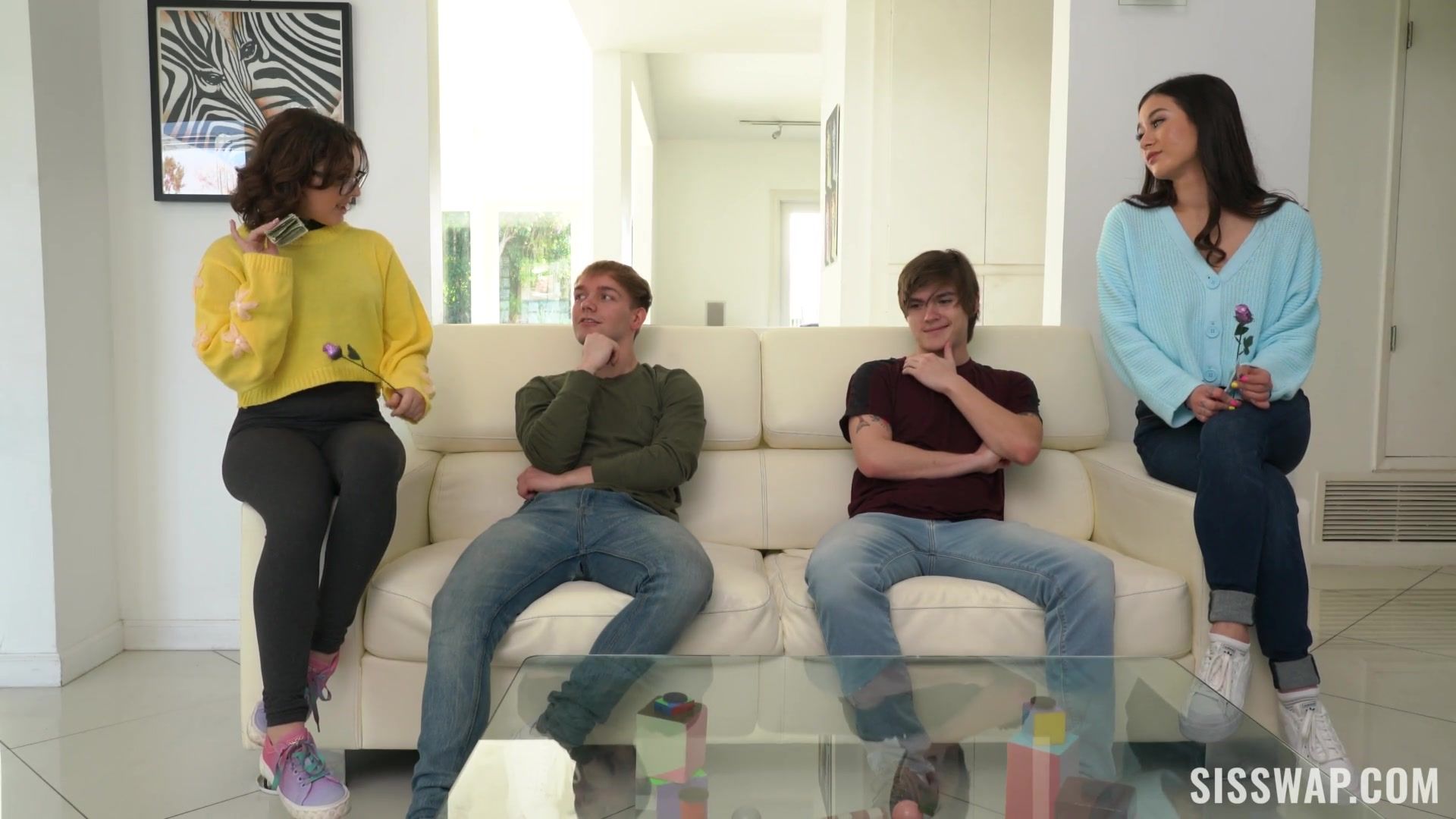 Групповой секс двух юных грудастых девушек с двумя молодыми ребятами