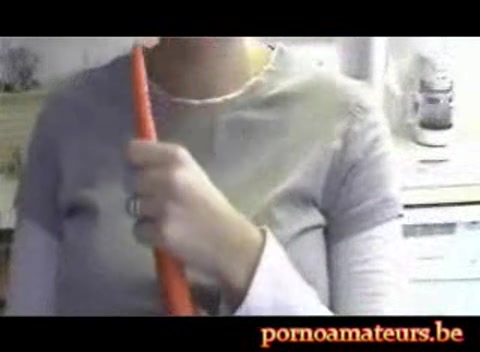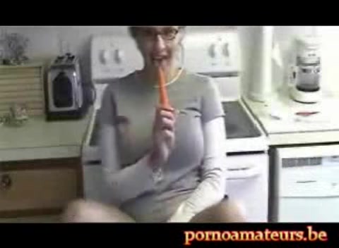 In the kitchen with a long carrot